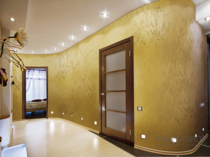 Интерьерный декоративный финиш с кварцевым наполнителем и перламутровым золотым эффектом. Используя специальную золотую базу, также заколерованную в различные цвета, открывает возможность создавать превосходную и глубокую текстуру пустынных песков. В данном случае текстура вертикального нанесения несет дополнительный эффект струящейся воды, что делает дизайн еще более экстравагантным и интересным, а также позволяет расширить визуально узкие пространства и сделать интерьер более свободным и легким к восприятию
