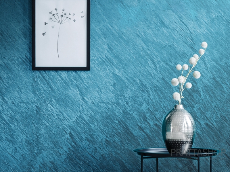 Интерьерное декоративное покрытие с кварцевым песочком и перламутровым эффектом. При использовании более глубоких цветов и оттенков текстура становится более выраженной и глубокой, а под мягким освещением в гостиной приобретает нежный эффект дождика.