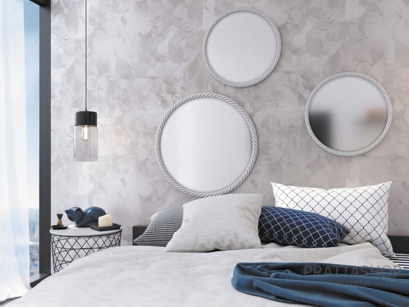 Декоративное покрытие для стен в интерьере с эффектом классического мокрого шелка. В данном случае светлый оттенок серого подчеркивает все изящества и мягкую глубину текстуры натуральной ткани с нежным тактильным эффектом.