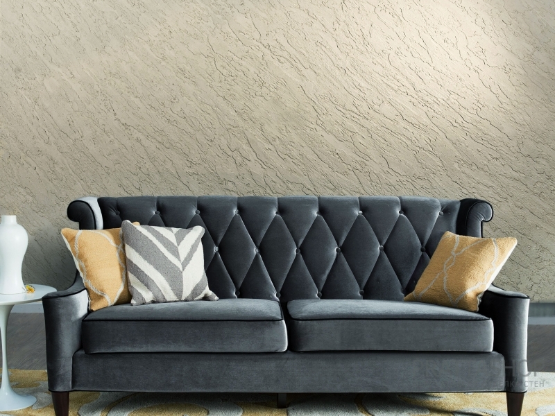 Интерьерное декоративное покрытие с текстурой природного камня в гостиной. Минеральная штукатурка на акриловой основе для создания различных фактур с эффектом натурального камня. Пластичные свойства материала и широкая цветовая гамма открывают огромные возможности для вашего творчества. Данное покрытие колеруется в массе, поэтому поверхность способна скрывать легкие царапины, что актуально для декорирования поверхностей в общественных местах.