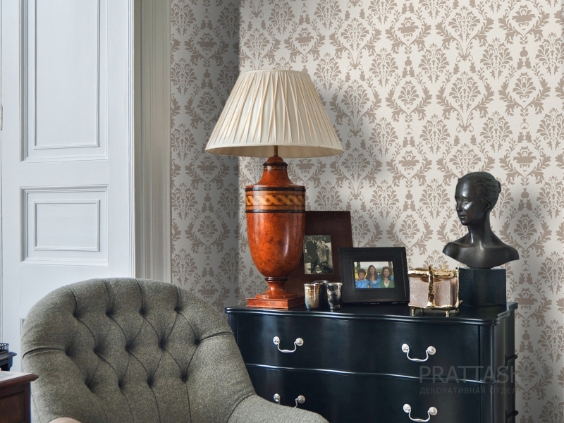 Дизайн стен с эффектом бесшовных текстильных обоев. Экологичный материал на основе гашеной извести и минеральных наполнителей, обладает высокой прочностью и долговечностью. В качестве основы использовался светло-бежевый цвет и темный оттенок того же цвета для трафаретного узора, выполненных из штукатурки INTONACHINO. Благодаря специальному финишному покрытию - VELATURA, поверхность обладает моющимися и водостойкими свойствами. Покрытие соответствует сертификации пажаробезопасности степени КМ-0.