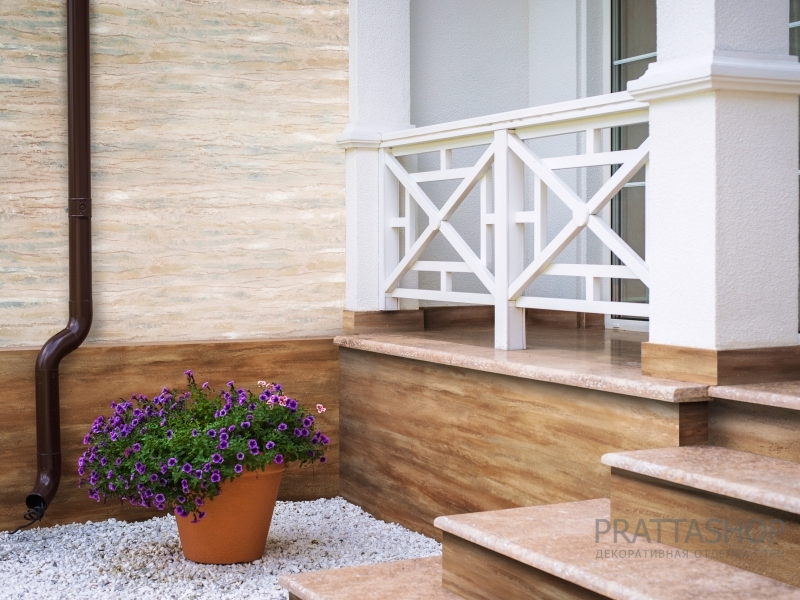 Комбинация цветов и эффекта натурального Римского Травертина на фасаде дома. Покрытие обладает высокой прочностью и влагостойкостью, легко поддается влажной чистке и локальной реставрации, что делает его абсолютно подходящим для декорирования стен в общественных помещениях и домашних интерьерах любых типов. В основе данного покрытия используется известковая минеральная штукатурка TRAVERTINO IMPERIUM, получившая сертификат пожаробезопасности категории КМ-0 (негорючий).