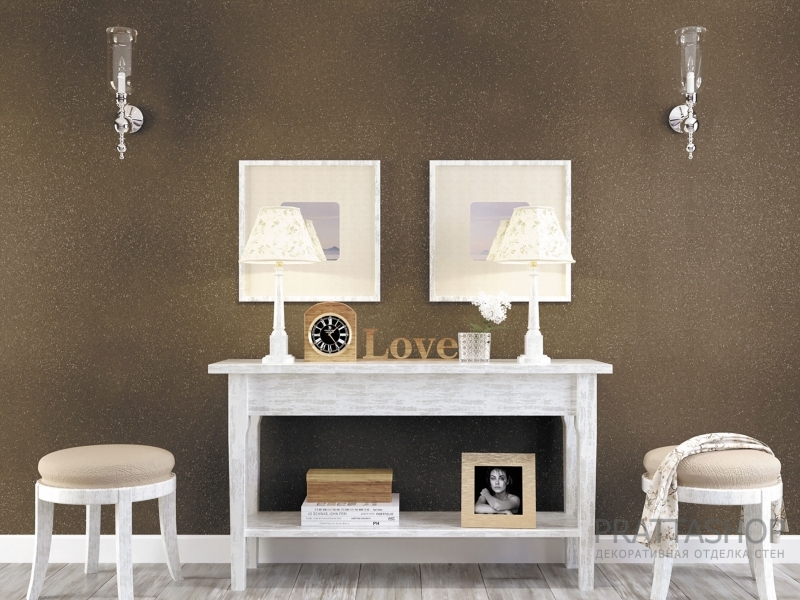 Интерьерное покрытие с эффектом матовой велюровой ткани и с серебряными мерцающими блестками. При использовании темных и насыщенных цветов, мерцающие серебряные блестки становятся более выразительными на поверхности. Блестки проявляются только в момент изменения угла обзора или освещения, что придает декору дополнительный акцент с ненавязчивой привлекательностью. Покрытие является влагостойким и моющимся, поэтому не требует дополнительной защиты от влаги.