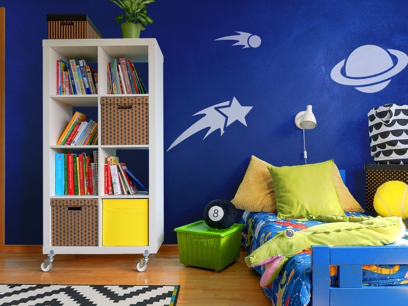 Декор стен для интерьера детской комнаты с эффектом звездного неба. Эта красивая композиция выглядит как звезды в ночном небе с мягкими серебряными блестками, которые добавляют окружающей среде настоящий эффект космического пространства. В данном дизайне применены специальные трафаретные силуэты, которые наполняют дизайн астрономической тематикой для Ваших детей. Благодаря особым характеристикам материала, это покрытие очень легко моется и обладает водостойкими свойствами, поэтому все эти свойства делают его идеальным для детской комнаты.