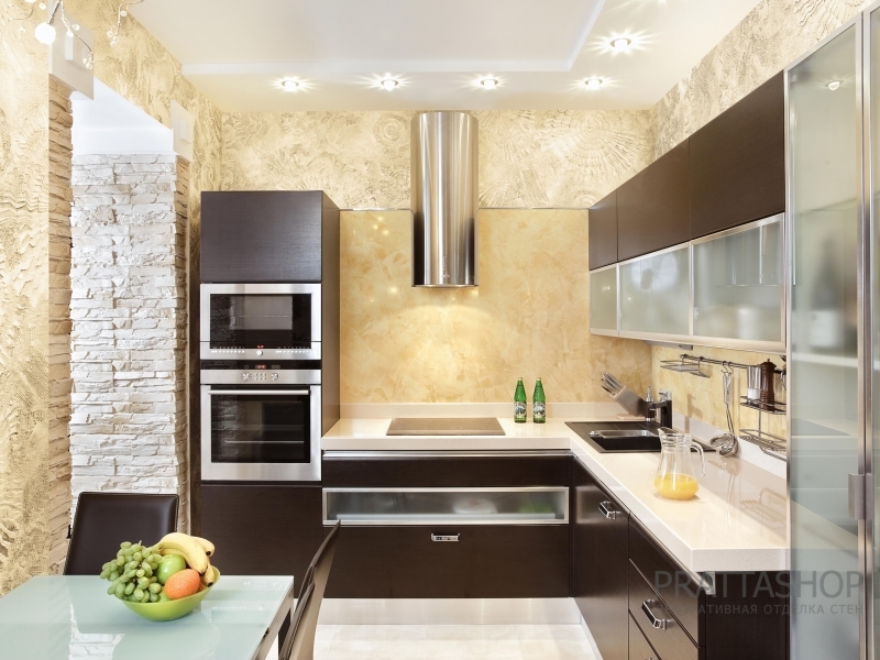 Стены на кухне в стиле Marine Design. Экологически чистый материал на основе гашеной извести и минеральных наполнителей, обладает высокой прочностью и долговечностью. Благодаря использованию нескольких цветов специального защитного материала CERATO покрытие приобрело прекрасное сочетание цветов и отличную защиту от прямого воздействия воды.