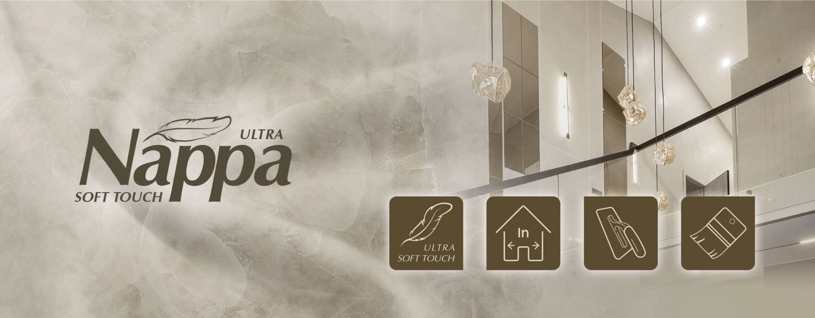 Покрытие NAPPA в качестве декоративного покрытия обеспечивает тактильный и визуальный эффекты натуральной замши или нубука. Позволяет воспроизвести замшевое полотно без швов и соединений на стенах, потолках, колоннах, лепнине и других архитектурных деталях внутри помещений.