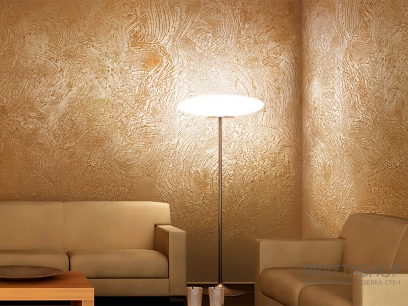 Рельефное декоративное покрытие с эффектом перламутровой драповой ткани в гостиной. Экологичный и долговечный материал на акриловой основе, покрытый специальным металлизированным финишем METALLINE, который придает покрытию перламутровый оттенок и цвет, а также обеспечивает устойчивость к влажной среде и моющиеся свойства.