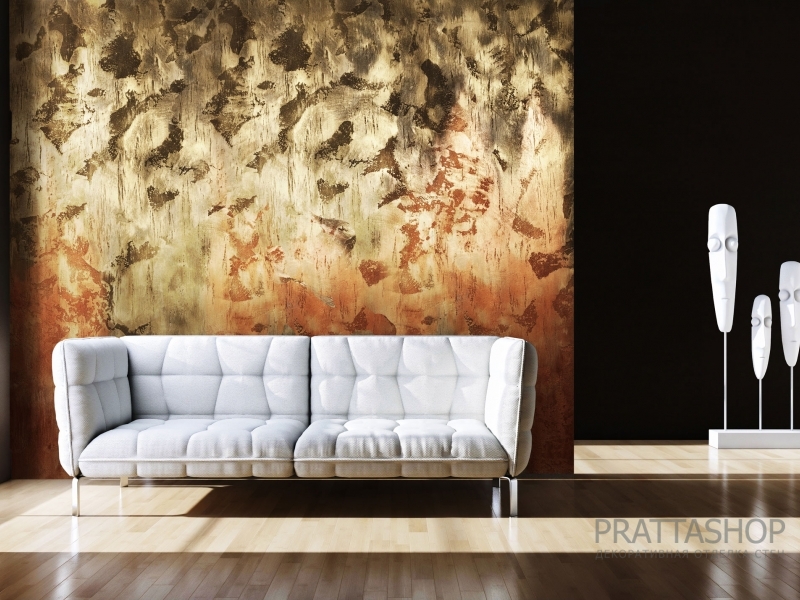 Моющееся, прочное, экологически чистое покрытие покрытие с текстурой античного камня и металлизированным эффектом. Данное сочетание двух финишных покрытий серии METALLINE позволяет создать мягкий эффект градиенты двух оттенков: бронзы и меди.