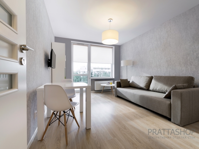 Декоративное покрытие для стен в интерьере с эффектом Флорентийского шелка. Натуральный пигмент жемчуга в составе материала и серо-голубой цвет исполнения позволили передать всю глубину и нежность текстуры натуральной шелковой ткани с приятным тактильным эффектом.